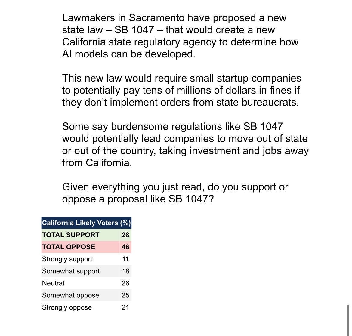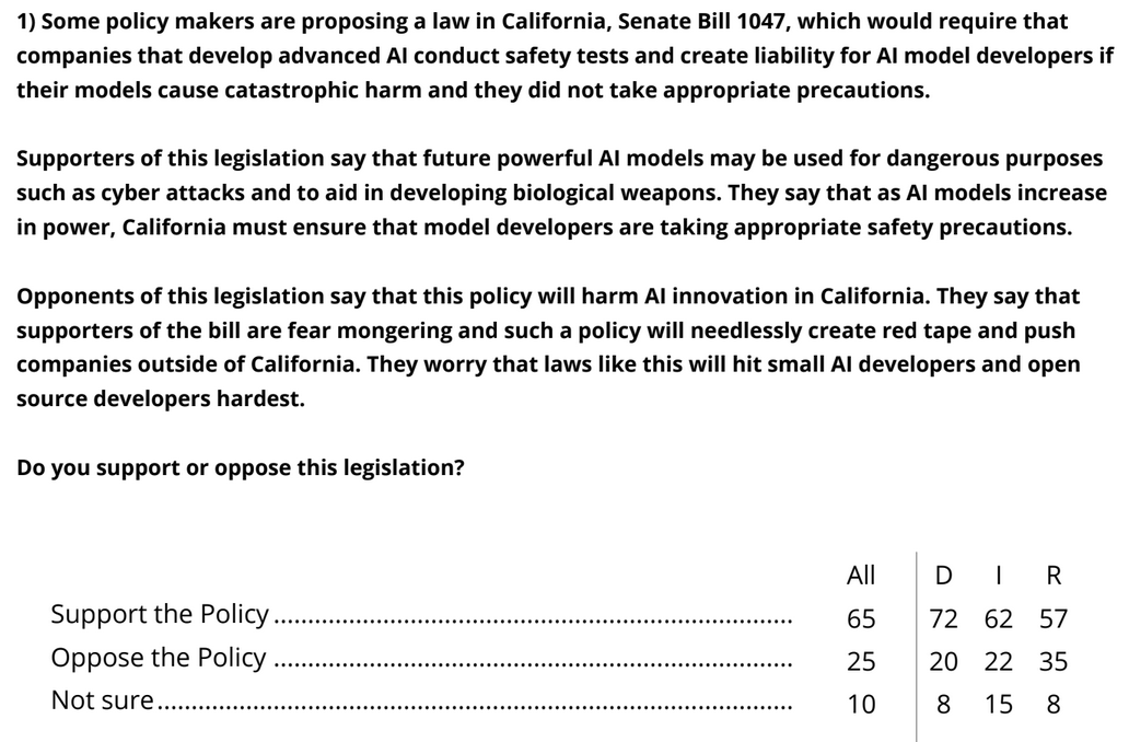 The debate over SB 1047 has been dominating for weeks. I’ve now said my peace on the bill and how it works, and compiled the reactions in support and opposition. There are two small orders of business left for the weekly. One is the absurd Chamber of Commerce ‘poll’ that is the equivalent of a pollster asking if you support John Smith, who recently killed your dog and who opponents say will likely kill again, while hoping you fail to notice you never had a dog.